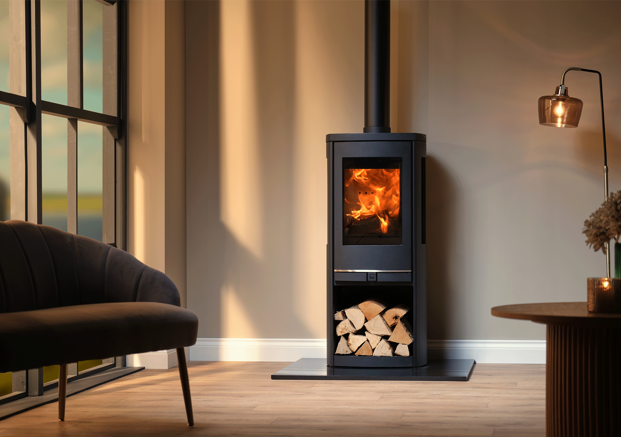 Tall, striking, and effortlessly refined, the Athena W-T wood burning stove is a bold expression of contemporary luxury. Its elongated form and brushed steel detailing create a commanding presence, while the expansive glass viewing window and double glazed side panels offer a captivating view of the dancing flames, all while enhancing efficiency and heat retention.